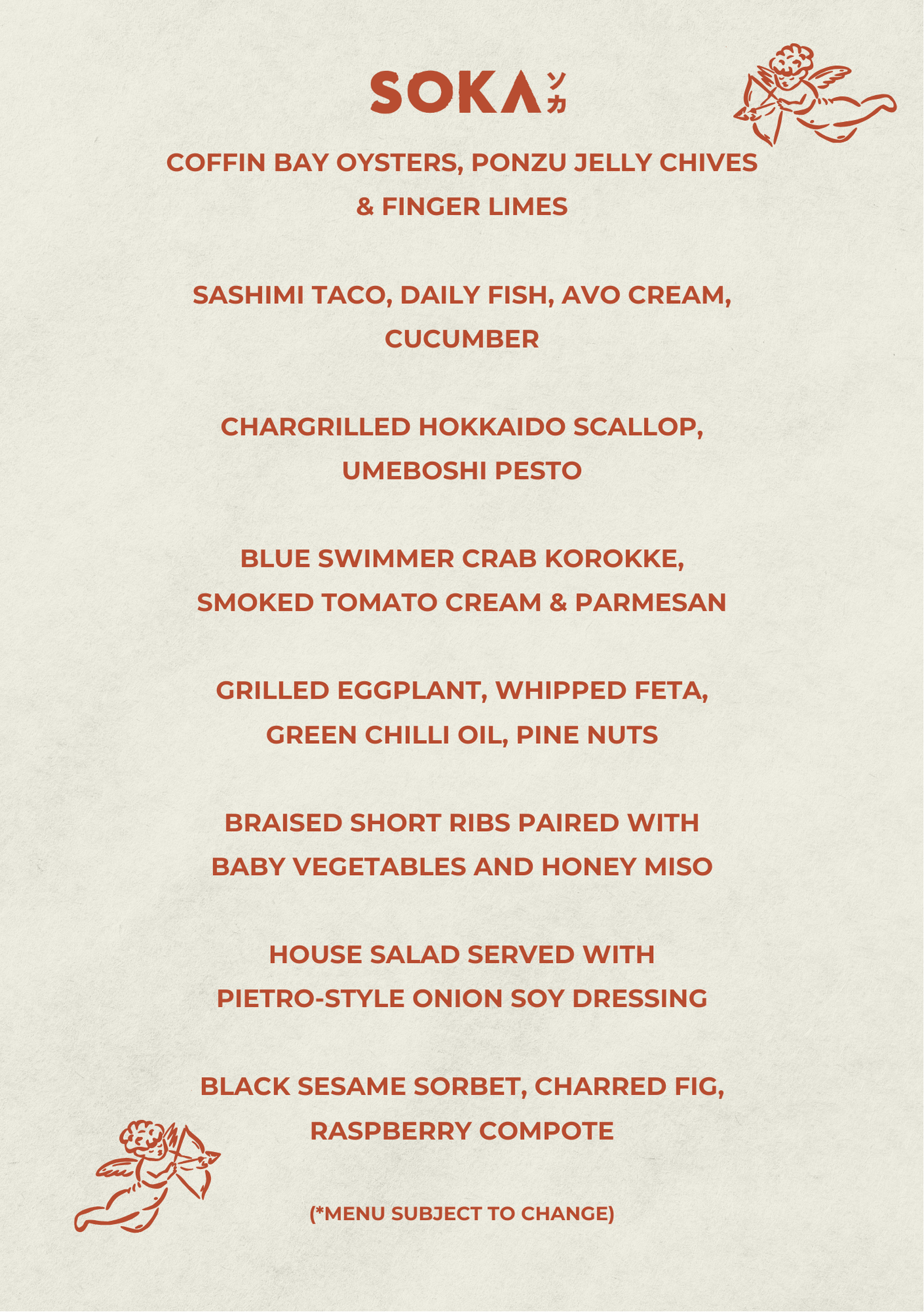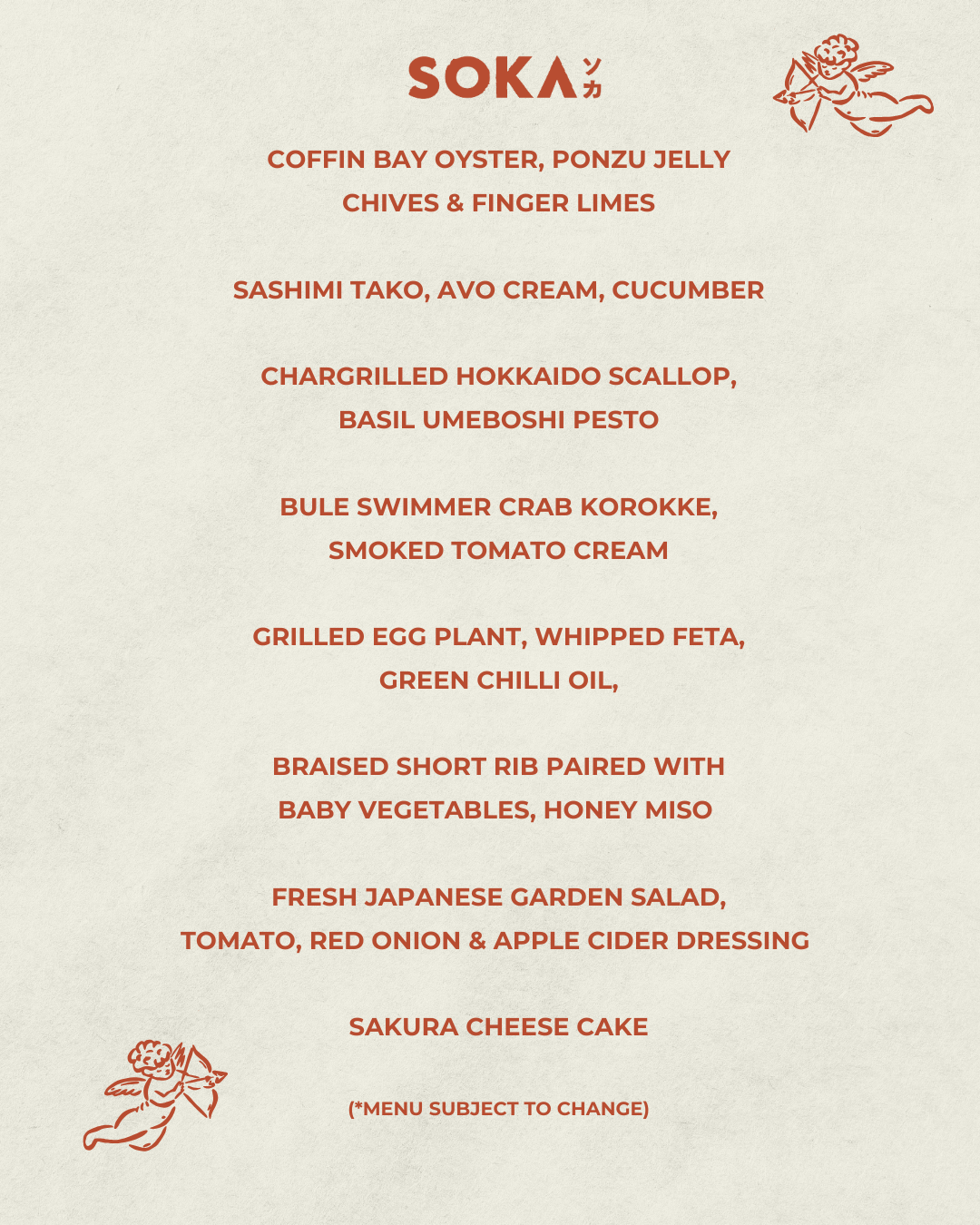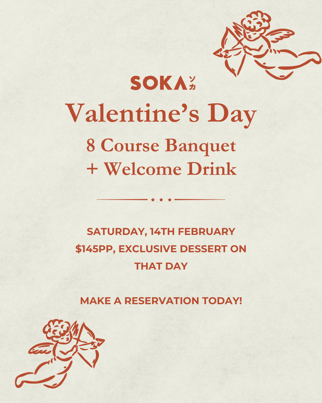 As this is a Valentine’s Day special banquet, we’re unable to accommodate dietary substitutions. If you have dietary needs, we recommend our SOKA Banquet, which offers 7 variations to suit most requirements just let us know in advance so we can provide the best experience for you.